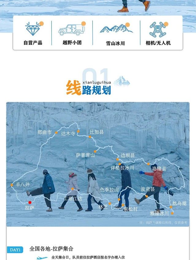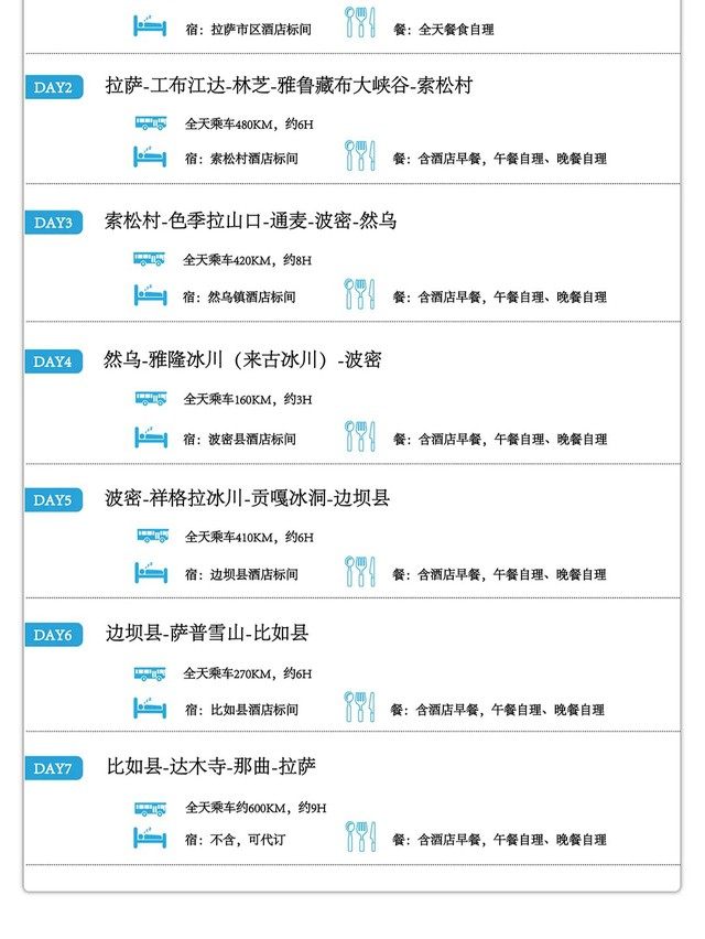 2025全年组队11期,欢迎独立定制 第01期:2025年12月06日集合-12月12日散团 第02期:2025年12月13日集合-12月19日散团 第03期:2025年12月20日集合-12月26日散团 第04期:2025年12月27日集合-01月02日散团 第05期:2026年01月10日集合-01月16日散团 第06期:2026年01月17日集合-01月23日散团 第07期:2026年01月24日集合-01月30日散团 第08期:2026年01月31日集合-02月06日散团 第09期:2025年02月15日集合-02月21日散团(春节) 第10期:2025年02月17日集合-02月23日散团(春节) 第11期:2025年02月28日集合-03月06日散团 全年执行活动价格:6280元/人,春节活动价格:7280元/人 Day1全国各地-拉萨集合 今日全国各地的队友将来到拉萨集合,统一入住我俱乐部安排的酒店。如果您的时间比较宽裕,可以自行安排在拉萨市区的旅游活动,拉萨火车站距市区10公里,可打车到集合酒店。贡嘎机场距拉萨市区65公里,可乘坐机场大巴到拉萨贡嘎机场乘车点民航局门口下车,再打车到集合酒店办理入住,当天尽量少运动,多休息。晚上会统一召开行前见面会,讲解本次活动注意事项。 住宿:拉萨酒店(标间) 餐饮:全天自理 海拔:拉萨约3650米 温馨提示: 1、拉萨机场大巴费用30元(有航班就有班次),打车费用200元左右; 2、如果时间宽裕的话,建议可以提前1-2天抵达拉萨,适应海拔; 3、注意不要剧烈运动,当天请不要洗澡,可多吃蔬菜、水果,多喝水,不能饮酒。一般过1-2天后,以上症状都会逐步减轻或消失。 Day2拉萨-林芝-雅鲁藏布大峡谷-索松村 今天到达的目的地是有西藏江南之称的林芝索松村,其海拔较低,大家正好做进一步的调整,以适应高原环境。经林拉高速进入林芝后,我们将深入雅鲁藏布大峡谷内的索松村,这里是拍南迦巴瓦峰的绝佳位置。傍晚我们便到达索松村入住,大家可尽情地拍摄南迦巴瓦。冬季天气较稳定,大家可在此守候日照金山。 餐饮:含酒店早餐;午、晚餐自理 住宿:索松村客栈(双人标间) 海拔:索松村海拔3012米 需时:全程约480km,行车约6小时 Day3索松村-色季拉山口-通麦-波密-然乌镇 早餐后出发翻越色季拉山口,位于八一镇的东南侧,是川藏线上著名的地标。色季拉山口海拔4728米,视野开阔,可以远眺到鲁朗林海和背后的南迦巴瓦峰,是拍照的好地方。之后乘车前往波密,途径通麦大桥,它是川藏公路南线318国道著名通麦天险路段上的咽喉工程,在同样的位置分布着不同历史时期的三座跨江大桥,主要通车的为通麦特大桥为单塔斜跨大桥,如今三座大桥成为了一道风景线。经过波密县城后沿途络绎不绝的雪峰相伴,森林与雪山的美丽画卷将我们一路护送至然乌湖,冬季的中然乌结冰后,远远看去宛如一块巨大的蓝宝石,运气好还能遇到然乌湖边村落赶羊过冰湖的场景。晚上入住然乌镇酒店。 餐饮:含酒店早餐;午餐、晚餐自理 住宿:然乌镇酒店标间 海拔:色季拉山口4728米、然乌镇3900米 需时:全程420km,行车约8小时 Day4然乌镇-雅隆冰川(来古冰川)-波密县 早餐后我们出发前往来古冰川。从然乌镇到来古村一直是沿着有西天瑶池之称的然乌湖岸边驰骋,湖两岸的灌木丛叠加上蓝天和湖面,一幅幅绝美画卷展现在眼前。来古冰川是一组冰川的统称,包括美西、雅隆、若骄、东嘎、雄加和牛马冰川,而雅隆冰川是来古冰川中最为壮观的一条,长12公里。我们预留了充足的时间,大家可以尽情地游玩拍摄,深入感受行走在蓝冰之上的震撼,而后我们返回波密入住。 餐饮:含酒店早餐;午餐、晚餐自理 住宿:波密县酒店标间 海拔:雅隆冰川4400米,波密2900米 需时:全程约205km,行车3小时左右 Day5波密县-洛隆县-祥格拉冰川-边坝县 早餐后出发,翻越5100米的垭口途径洛隆县,继续前往边坝县祥格拉冰川,这里可选择乘坐当地中转摩托车前往贡嘎冰洞(车费往返200元/人,需自理)而后前往祥格拉冰川,这里可以尽享古冰川世界的美景,零距离接触打卡蓝冰、冰壁,游玩后晚上入住边坝县城酒店。 餐饮:含酒店早餐;午(路餐)、晚餐自理 住宿:边坝县酒店标间 海拔:贡嘎冰洞约4500米,祥格拉冰川4100米,边坝县3650米 需时:全程约410km,车程约 6小时 温馨提示: 1、冰川及冰洞,模样每年都会变化,以实际景观为准。 2、贡嘎冰洞当地政策可能会有管控不让上。 Day6边坝县-萨普大本营-比如县 早餐后出发,前往达萨普神山,萨普神山位于比如县羊秀乡普宗沟境内,千百年来一直矗立于此,周围群山环绕,主峰被尊为当地的神山之王。需要去内湖自行乘坐中转车100元/人。游玩后我们前往比如县酒店入住。 餐饮:含酒店早餐;午餐、晚餐自理 住宿:比如县酒店标间 需时:边坝到萨普神山车程约3小时;萨普到比如县车程约2小时 海拔:萨普内湖4700米,比如县3960米 Day7比如-达姆寺(骷髅墙)-那曲-拉萨 早餐后出发,前往比如县达姆寺骷髅墙。站在千年颅骨堆叠的天葬台前,在海拔4800米的寂静中直面生命的终极叩问。游玩后开始踏上归途,乘车穿越藏北草原的苍茫天地,念青唐古拉雪峰在远方默默相伴,傍晚时分抵达拉萨市区结束本次行程。 餐饮:含酒店早餐;午餐、晚餐自理 住宿:自理(可代订) 需时:全程约590km,行车约9小时 海拔:边坝3700米 温馨提示: 1、观看骷髅墙可能会引起不适,介意者慎入! 2、冬季道路复杂,请预留足够返程时间,或第二天返程。 【费用包含】 1、交通:全程用车,全程舒适越野车(4人一车); 2、餐饮:6顿早餐,正餐自理可自行AA; 3、住宿:6晚酒店标间; 4、门票:来古冰川门票,萨普观光