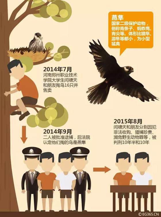 判决书显示,90后的闫啸天原是郑州一所职业学院的学生,2014年7月,他在家乡辉县市高庄乡土楼村和朋友王亚军在该村一树林内猎捕了12只燕隼。饲养过程中逃跑一只,死亡一只。之后,他通过网络发布将其余燕隼卖掉。之后,他俩在该树林内又猎捕了4只燕隼及隼形目隼科动物,随后,两人被辉县市森林公安局刑事拘留。之后,闫啸天因犯非法猎捕珍贵、濒危野生动物罪以及非法收购珍贵、濒危野生动物罪,数罪并罚,被判处有期徒刑10年6个月,王亚军犯非法猎捕珍贵、濒危野生动物罪被判处有期徒刑10年。